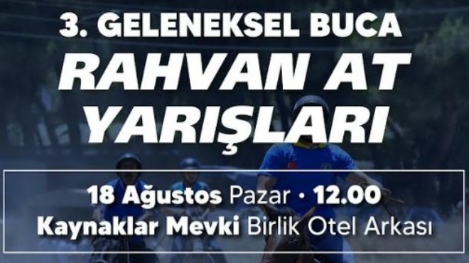 Buca Belediyesi ve Buca Rahvan Atlı Spor Kulübü iş birliğiyle 18 Ağustos Pazar günü saat 12.00’de Kaynaklar Sebze ve Meyve Hali yanında 3. Geleneksel Buca Rahvan At Yarışları düzenlenecek. Organizasyonda atlar, ikili tay, üçlü tay, dörtlü tay, taze beşli, deste, küçük orta, büyük orta, baş altı, baş atlar ve ithal A grubu olmak üzere toplam 10 kategoride yarışacak.