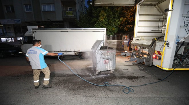 Gün boyu kent temizliği için sokak sokak alın teri döken Buca Belediyesi Temizlik İşleri Müdürlüğü ekipleri, akşam trafiğin rahatlamasıyla birlikte çöp konteynerlerindeki dezenfekte çalışmalarına hız kattı.