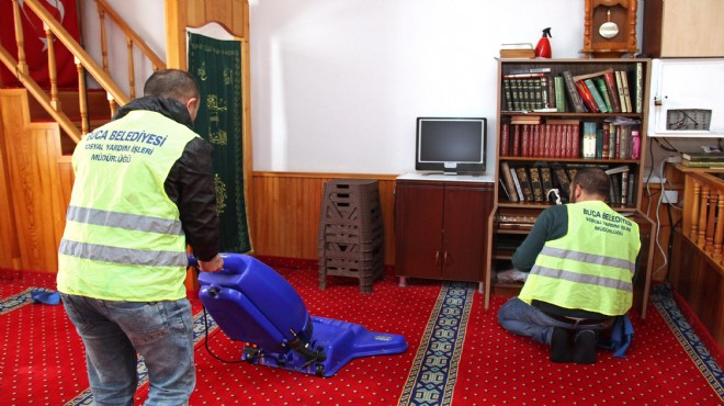 Yaz aylarının gelmesiyle ile birlikte ilçe genelindeki cami, cem evi ve kiliselerde temizlik çalışmalarını hızlandıran Buca Belediyesi, bünyesindeki 5 kişilik temizlik ekibiyle ibadethaneleri dip köşe temizliyor.