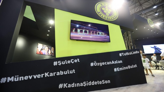 Türkiye genelinde son 10 yılda yaklaşık yüzde 400 oranında artış gösteren kadın cinayetleri ve kadına karşı şiddet vakaları nedeniyle bir farkındalık yaratmak isteyen Buca Belediyesi, “Kadına Şiddete Son” sloganıyla stantta özel bir alan yaptı.