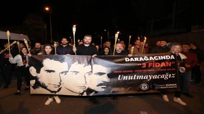 Anma töreni için Buca Tenis Kulübü önünde toplanan Bucalılar, Üç Fidan Anıtı önüne kadar ellerinde meşaleler ve pankartlar eşliğinde yürüdü. Anıtın önünde, Deniz Gezmiş ve arkadaşlarının mücadelesini anlatan belgesel gösterimi yapıldı. Daha sonra, idamların gerçekleştiği saat 05.30’da saygı duruşu gerçekleştirildi. Saygı duruşunun ardından da Üç Fidan Anıtı’na kırmızı karanfil bırakıldı.