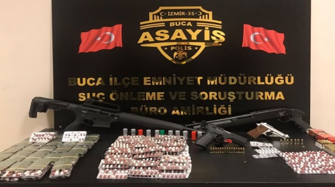 Buca İlçe Emniyet Müdürlüğü ekipleri, E.K. (22) VE B.K.'nin ilçede uyuşturucu madde satışı yaptığını tespit etti. Harekete geçen polis ekipleri, 2 şüphelinin adreslerine operasyon düzenledi. Operasyonda yapılan aramalarda yeşil reçeteye tabii 3 bin 28 adet uyuşturucu hap, 2 tabanca ve çok sayıda mermi ele geçirildi. Gözaltına alınan E.K. ve B.K., sorgulanmak üzere emniyete götürüldü. Emniyetteki işlemlerinin ardından adliyeye sevk edilen 2 şüpheli, çıkarıldıkları mahkemece tutuklandı. (DHA)