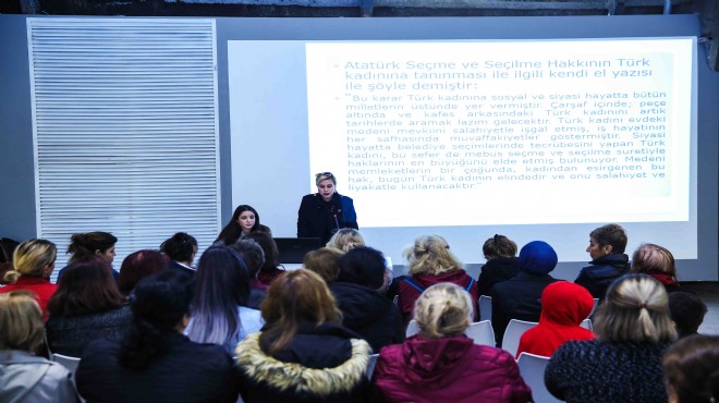 Buca Belediyesi “5 Aralık Türk Kadınına Seçme ve Seçilme Hakkı Verilmesi Günü” nedeniyle Atatürk Maskı Eğitim Atölyesi’nde seminer düzenledi. Atatürk’ün gölgesinde bir araya gelen Bucalı kadınlara Avukat Seda Gürer ve Avukat Tuğçe Denizer tarafından seçme ve seçme hakkının neler sağladığı anlatıldı. Daha sonra Buca Kent Konseyi işbirliğiyle Buca Belediyesi Meclis Salonu’nda düzenlenen söyleşiye Buca Kent Konseyi Başkanı Mürüvet Balcılar ve Dokuz Eylül Üniversitesi Hukuk Fakültesi Milletlerarası Hukuk Anabilim Dalı Dr. Öğr. Üyesi Münevver Aktaş konuşmacı olarak katıldı.