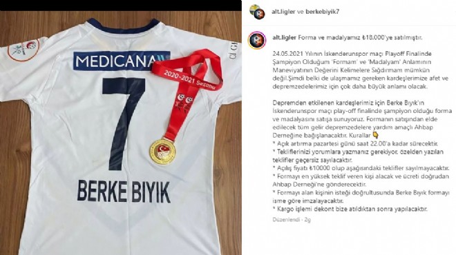 Berke'nin forması ve madalyası 23 bin TL'ya satıldı ve bu para vatandaşlara aktarıldı. Berke yaptığı açıklamada, "24.05.2021 tarihinde İskenderunspor'la oynadığımız Play-Off finalinde şampiyon olduğum formam ve madalyamın maneviyat değerini kelimelere sığdırmam mümkün değil. Şimdi formam ve madalyamın depremzedelerimiz için çok daha büyük anlamı olacak" dedi. Öte yandan Bucasporlu futbolcular, depremzedeler için antrenman öncesi saygı duruşu yaptı. (DHA)
