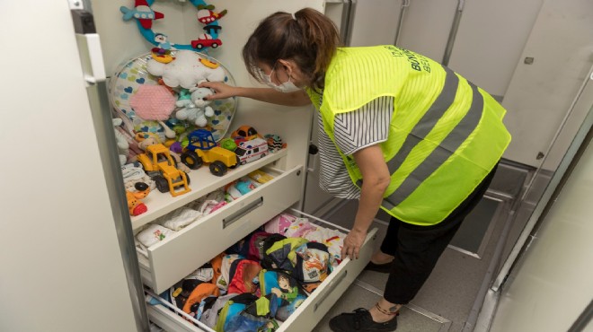 İlk olarak Buca’nın Göksu Mahallesi’ndeki yurttaşlarla buluşan mobil giysi otobüsü çocuklara erken bayram sevinci yaşattı. Koronavirüsle mücadele kapsamında aileler otobüse sırayla alınırken, ateş ölçerle ateş kontrolü de yapıldı. Gardırop şeklinde dizayn edilen otobüste çocuklar için kıyafet, ayakkabı ile oyuncak bulunurken spor formasından takım elbiseye, nişanlıktan, kadınlar için etek ve pantolona, kravattan, şala ve çoraba kadar geniş bir yelpazeye sahip yeni kıyafetler yer alıyor. Deneme kabinlerinin de bulunduğu otobüste yurttaşlar kendi bedenlerine ve zevklerine uygun kıyafetleri seçebiliyor.