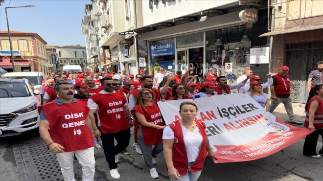 Konak Meydanı'nda bir araya gelen sendikaların yönetimi ve üyeleri, sloganlarla Büyükşehir Belediyesi Egemenlik Binası önüne yürüdü.