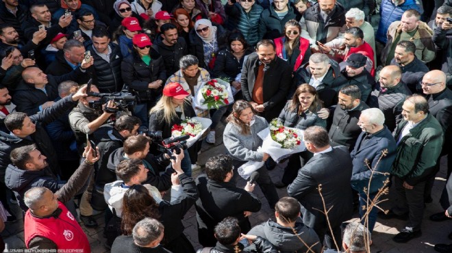 DİSK Ege Bölge Temsilcisi Memiş Sarı ise “Biz aslında bir yolun aynı yolcusuyuz. Bu kenti hep birlikte büyütmek bu kentin insanlarına hep birlikte hizmet etmek için çalışıyoruz. Dönem dönem ufak tefek sorunlar yaşayabiliriz ama tüm ülke ve İzmir bilsin ki biz İzmir Büyükşehir Belediyesi çalışanları İzmir Büyükşehir Belediye Başkanı Cemil Tugay ile aynı yolu yürüyoruz. Bu yanlış anlaşılmayı ortadan gidermek adına bugün arkadaşlarımızla Başkan’ımıza çiçek vermek ve ona teşekkür etmek için buradayız. Bilsinler ki bundan sonra da aynı yolda bu kente hizmet etmek için yan yana yürüyeceğiz. Sağda solda parçalanmış görüntü vermek isteyenlere hep birlikte ‘kurtuluş yok tek başına ya hep beraber ya hiçbirimiz’ diyoruz” ifadelerini kullandı.