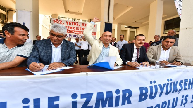 Gizem TABAN/GERÇEKİZMİR- Büyükşehir Belediyesi’nde çalışan toplam 5 bin 740 memuru ilgilendiren TİS (Toplu İş Sözleşmesi) İzmir Büyükşehir Belediyesi ve KESK’e bağlı ( Kamu Emekçileri Sendikası) Tüm Bel-Sen 1 Nolu Şube arasında yapılan imza töreniyle gerçekleşti. Büyükşehir belediyesi önünde yapılan imza törenine; İzmir Büyükşehir Belediye Başkanı Tunç Soyer, Cumhuriyet Halk Partili (CHP) bazı ilçe belediye başkanları , Tüm Bel-Sen 1 Nolu Şube Başkanı Anıl Acar, Tüm Bel-Sen Genel Başkanı Erdal Bozkurt ve büyükşehir belediyesi memurları katıldı. Törenin gerçekleştiği alanda TİS maddelerinin yazılı olduğu dev pankartlar yer aldı. Törende İzmir Büyükşehir Belediye Başkanı Tunç Soyer ve Tüm Bel-Sen 1 Nolu Şube Başkanı Anıl Acar önemli mesajlar verdi. Sendika ile belediye arasında imzalanan ve 1 Nisan tarihinden itibaren geçerli olan yeni toplu iş sözleşmesine göre; memurlara ikramiyeler dışında yüzde 72 zam (1600 lira) yapıldı.