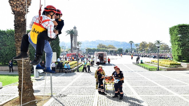 Yangın alarmını duyan güvenlik ekibinden bir kişi hemen 112’yi ve110’u aradı. Santral görevlisi “Tüm personel ve ziyaretçilerin panik olmadan, toplanma alanına yönlenmeleri önemle rica olunur” şeklinde 3 kez anons geçti. Binada bulunan tüm personel ve ziyaretçiler, tatbikatta görevli personelin talimatlarına uyup seri bir şekilde binayı boşaltarak İzmir Saat Kulesi tarafında bulunan toplanma alanına yönlendirildi. Yangın alarmıyla birlikte, Arama Kurtarma ve Tahliye Ekipleri tüm katları dolaşarak binadan henüz çıkamamış personel ve ziyaretçileri acil çıkış kapılarına yönlendirdi.