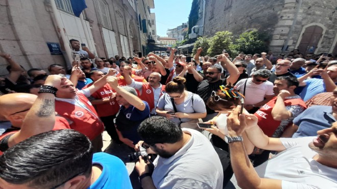 Devrimci İşçi Sendikaları Konfederaasyonu'na (DİSK) bağlı Genel İş 1,2,3, ve 9 No'lu şubelerde örgütü işçiler bayram ikramiyelerinin ödenmemesi nedeniyle Konak’taki Büyükşehir Belediyesi Egemenlik Binası önünde eylem yaptı.