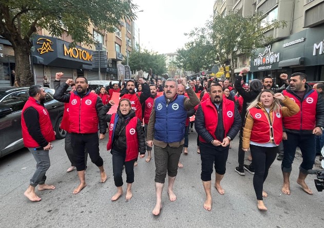 İşçiler “Çıplak maaşa, çıplak ayak" diyerek ile başlattıkları eylemde, sendika binasından Kültürpark’a yürüdü. İşçiler burada bir basın açıklaması gerçekleştirdi.