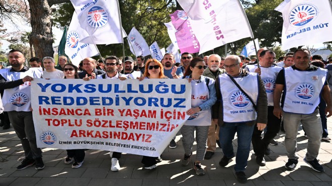"Sosyal denge tazminatı için 8 bin 500 olan talebimize karşı 6 bin 500 lira ve her biri 3 bin lira olan 6 ikramiye talebimize 2 bin 200 lira önerildi. Gıda yardımı olarak önerdiğimiz aylık 750 lira olan talebimize karşılık kara mizaha konusu olacak bir öneriyle yılda bir defaya mahsus 2 kilo kıyma verilmesi teklif edilmiştir. İzmir halkına doğumdan ölüme kadar yaşamın her alanında hizmet sunan belediye emekçilerine reva görülen sadaka mahiyetindeki sefalet zamlarını kabul etmiyoruz. Taleplerimiz kabul edilene kadar üretimden gelen gücümüzün kullanılması da dahil olmak üzere demokratik direnme hakkımızı kullanacağız."