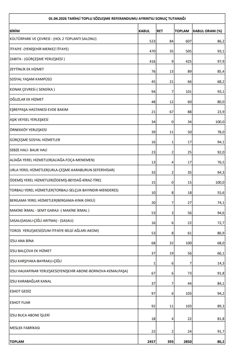 İzmir Büyükşehir Belediyesi, İZSU ve ESHOT bünyesinde görev yapan memurların oy kullandığı referandumda, toplu iş sözleşmesine güçlü destek geldi. Yapılan oylamada 2 bin 850 çalışan sandık başına giderken, 2 bin 457 “kabul”, 393 “ret” oyu kullanıldı. Böylece sözleşme yüzde 86,2 oranında kabul edildi.