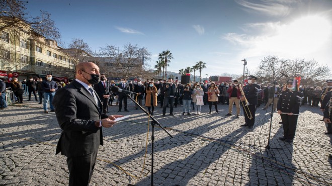 Kortej İzmir Büyükşehir Belediyesi Bandosu’nun marşları eşliğinde Kemeraltı’ndan Konak Meydanı’ndaki İzmir Valiliği önüne geldi. Burada konuşma yapan İzmir Büyükşehir Belediye Başkanı Tunç Soyer, İstiklal Marşı’nın Türkiye Cumhuriyeti’nin birlik, beraberlik ve bağımsızlığının sembolü olduğunu hatırlatarak, “İşgali ile Kurtuluş Savaşı'nı başlatan, kurtuluşu ile bağımsızlığın simge kenti güzel İzmir, başı dik ve özgür yaşama kararlılığından hiç vazgeçmedi. Büyük kurtarıcımız Gazi Mustafa Kemal Atatürk'ün ifadesiyle, ‘bir daha üzerine hiçbir kirli ayağın basamayacağı kutsal bir toprak’ olan İzmir'den, yüreği vatan aşkıyla çarpan tüm yurttaşlarımıza selam olsun. Mustafa Kemal Atatürk'ü, Kurtuluş Savaşımızın tüm kahraman şehitlerini ve ‘Allah bu millete bir daha İstiklal Marşı yazdırmasın&rsq uo; diyen, İstiklâl Marşımızın şairi Mehmet Akif Ersoy'u, saygı ve rahmetle anıyorum” dedi.
