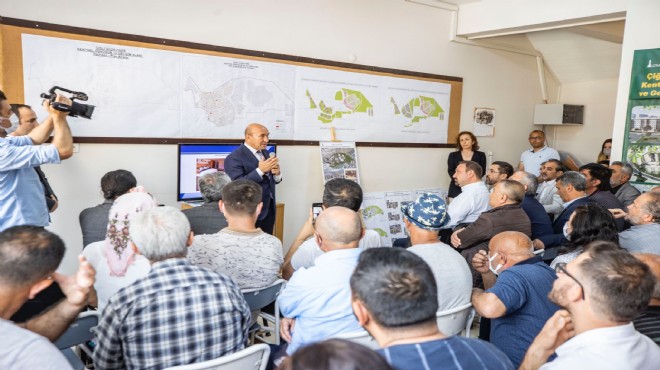 Başkan Soyer toplantıda “Burada gördüğünüz çalışmada özet itibariyle sizlerin önerileriyle, sizlerin talepleriyle ve sizin içinize sinsin diye bu değişiklikler yapıldı. Bir kere öncelikle binaların konumlandırılması değiştirildi. Eğime göre, vadinin konumuna göre ve manzaraya göre değişti. İkincisi, vaziyet planında bloklarda 7 daire vardı, bu sizlerden gelen talepler doğrultusunda 4’e indirildi ve metrekareler biraz daha büyütüldü. Ev içindeki mutfaklar da açık mutfak olmaktan çıktı. Kısacası yapılan tüm çalışmalar sizin istekleriniz doğrultusunda yeniden yapıldı” diye konuştu.