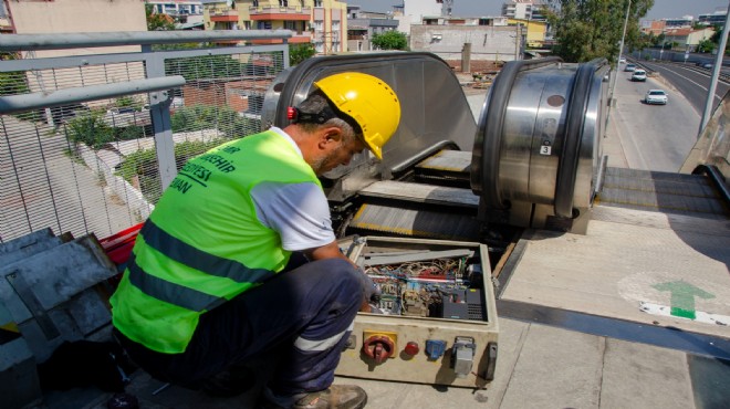 Kent genelinde 123 asansör ve 127 yürüyen merdivenin bakım ve onarımı 32 teknik personel ile yürütülüyor. Kentin kuzey ve güneyinde ayrı ekipler görevlendiriliyor. Söz konusu ünitelerin gerek rutin bakımları gerekse arızalara müdahale ve yedek parça değişimleri etkin bir şekilde yapılıyor. İzmir Büyükşehir Belediyesi Yapı İşleri Dairesi Başkanlığı Tesisler Bakım Onarım Şube Müdürlüğü bünyesinde asansör ve yürüyen merdiven şefi olarak görev yapan İlhan Özkan, “Vandalizm ve hırsızlık olayları ünitelerin faal tutulabilmesini güçleştiriyor. Ünitelerin sürekli çalışır halde tutulması için ekipler sahada etkin bir şekilde mücadele etse de özellikle yürüyen merdivenlerin acil stop düğmelerine basılarak durdurulması vatandaşların merdivenlerden faydalanmasını olumsuz etkiliyor. Gereksiz yere merdivenleri durdurma olaylarına tanık olan vatandaşlarımızın uyarıda bulunması ve ALO 153 Hemşehri İletişim Hattı’nı arayarak tarafımıza bilgi vermesi çok önemli. Asansörlerin kapılarının tekmelenmesi, butonların sökülmesi, elektrik kablolarının çalınması gibi olaylar da oluyor. Tanık olan vatandaşların İzmir Büyükşehir Belediyesi ve kolluk güçlerini arayarak zararın önlenmesi adına hareket etmesi gerekiyor” dedi.