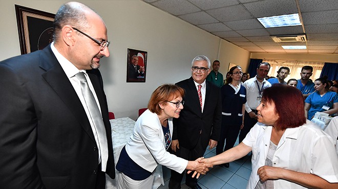 İzmir Büyükşehir Belediye Başkanı Aziz Kocaoğlu’nu eşi Dr. Türkegül Kocaoğlu, Eşrefpaşa Hastanesi çalışanlarının bayramını kutladı. Genel Sekreter Buğra Gökçe ve Başhekim Op. Dr. Ali Serdar Pedükcoşkun ile birlikte personelle tek tek bayramlayan Dr. Kocaoğlu, “Bayramlar birlik ve beraberlik duygularımızın yoğunlaştığı, dargınların barıştığı, tüm insanların sevgiyle kucaklaştığı çok önemli günlerdir. Huzurlu ve barış içinde geçireceğimiz nice bayramlar diliyorum” dedi.
