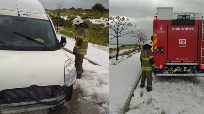 Büyükşehir Belediyesi ekipleri Çeşme ilçesinde sabah saatlerinde etkili olan karla karışık dolu yağışı ve fırtına nedeniyle alarma geçti. Dolu, Çeşme Germiyan’da kısa sürede hayatı olumsuz etkiledi. Yağış nedeniyle Çeşme – Germiyan yolu trafiğe kapanırken bölgedeki bir marketin sundurması oluşan yükten dolayı çöktü. İzmir İtfaiyesi ekipleri yolda kalan araçları kurtardı, temizlik çalışması yaparak kısa sürede yolun trafiğe açılmasını sağladı.