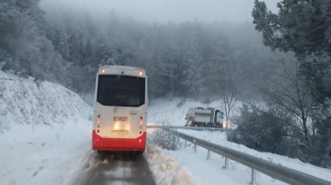 İzmir Büyükşehir Belediyesi ekipleri, kentin yüksek kesimlerinde etkili olan kar yağışı nedeniyle yol açma ve tuzlama çalışmaları yaptı.
