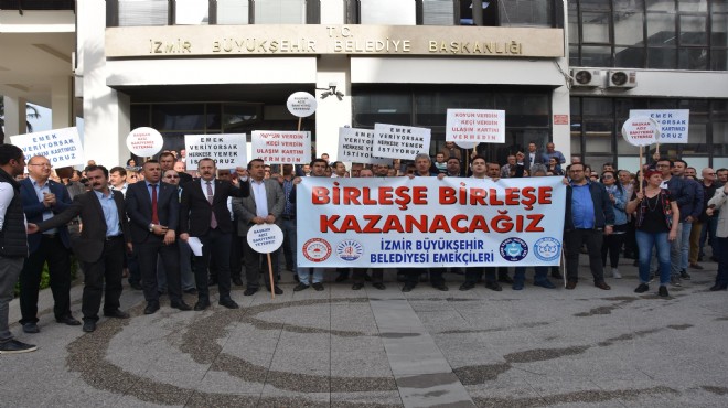 İzmir Büyükşehir Belediyesi ile yetkili sendika olan Birleşik Kamu-İş'e bağlı Tüm Yerel Yönetim Çalışanları Sendikası (Tüm Yerel-Sen) İzmir 1 No'lu Şube arasında süren toplu sözleşme görüşmelerinde uzlaşmaya varılamayınca, belediye memurlarının örgütlü bulunduğu 4 sendika ortak eylem kararı aldı. Tüm Bel-Sen, Tüm Yerel-Sen, Türk Yerel Hizmet-Sen, Bem-Bir Sen tarafından oluşturulan İzmir Büyükşehir Belediyesi Emekçileri Platformu üyesi yaklaşık 150 kişilik grup, bugün mesai öncesi Büyükşehir Belediyesi önünde toplandı. 'Birleşe birleşe kazanacağız' yazılı pankart taşıyan memurlar, "Başkan Aziz bakiyemiz yetersiz", "Ulaşım kartımız engellenemez" sloganları attı. Sendikaların hazırladığı ortak basın bildirisi, şube başkanları tarafından sırasıyla okundu.