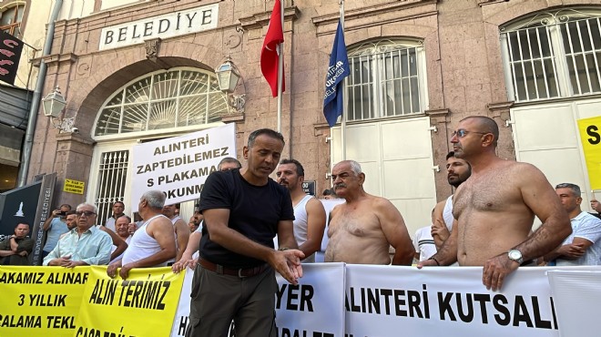 İzmir'de, "S plaka" ihalesinin iptali nedeniyle mağdur olduklarını iddia eden bir grup esnaf, Büyükşehir Belediyesi önünde yarı çıplak protesto eylemi yaptı.