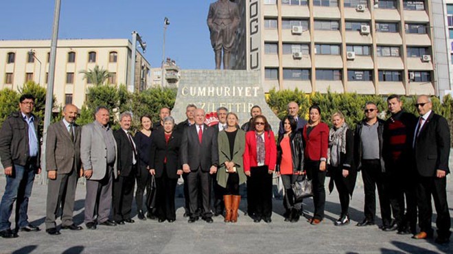 İZMİR - İlçe binasında yapılan toplantı sonrası Bornova Cumhuriyet Meydanı’nda Atatürk Heykeli’ne çelenk koyan CHP Bornova ilçe Başkanı Nevzat Kavalar, sonrasında partililerle beraber açtığı pankart ile CHP Genel Başkanı Kemal Kılıçdaroğlu’nun arkasında oldukları söyledi.