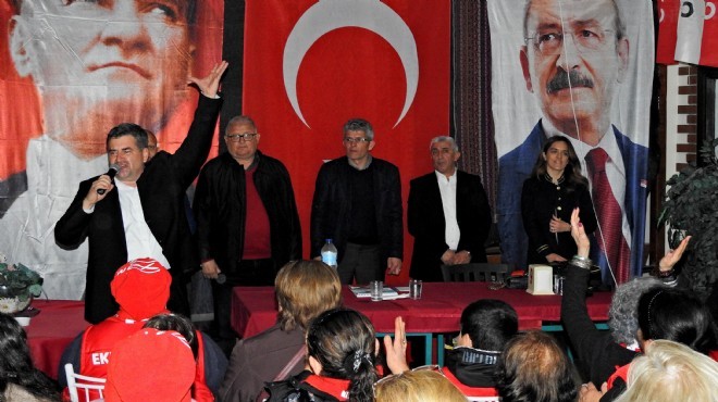Mahalle toplantısına katılan CHP Çeşme İlçe Başkanı Sait Kavasoğulları ile Millet İttifakı'nın ortağı İYİ Parti'nin İlçe Başkanı Volkan Evci de el ele tutuşarak mahallelileri selamladılar.