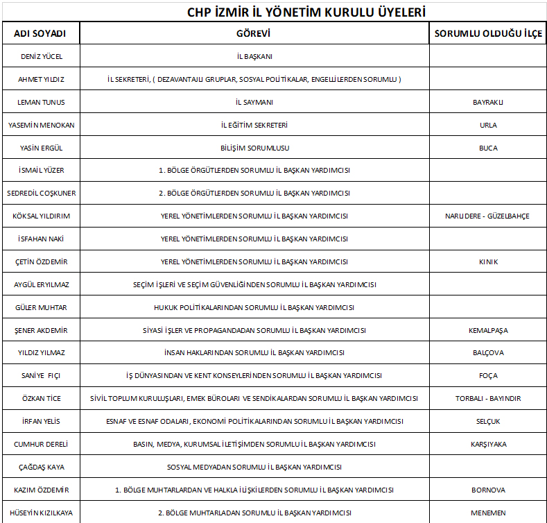 GERÇEKİZMİR – Cumhuriyet Halk Partisi (CHP) İzmir İl Başkanı Deniz Yücel, il yönetimi içinde geniş çaplı bir revizyon gerçekleştirdi.