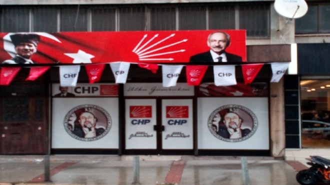 Ofisin girişinde Mustafa Kemal Atatürk ve CHP Lideri Kemal Kılıçdaroğlu’nun resimlerinin yanında Gümrükçü’nün ‘Yürüyelim arkadaşlar’ çıkartması ile CHP logosu bulunuyor.