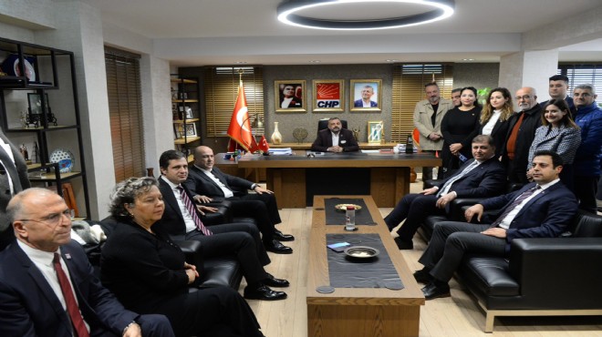 CHP'de İzmir Büyükşehir Belediye Başkan Adayı Cemil Tugay, CHP Parti Sözcüsü Deniz Yücel, Genel Başkan Yardımcısı Murat Bakan ve ilçe belediye başkan adaylarıyla birlikte CHP İl Başkanı Şenol Aslanoğlu'nu makamında ziyaret etti.