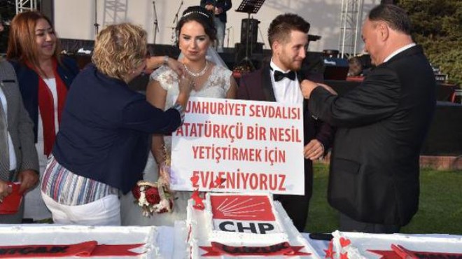 CHP İzmir İl Örgütü, CHP'nin 94'üncü kuruluş, İzmir'in 95'inci kurtuluş yıldönümü nedeniyle Tarihi Havagazı Fabrikası'nda kutlama yaptı. İl Başkanı Asuman Ali Güven, il yönetimi, ilçe başkanları, İzmir Büyükşehir Belediye Başkanı Aziz Kocaoğlu, Başkan Vekili Sırrı Aydoğan, CHP'li ilçe belediye başkaları ve partililer kutlamaya katıldı. Şehitler için saygı duruşunda bulunulması ve İstiklal Marşı'nın okunmasının ardından kutlama töreninde ilginç bir an yaşandı. Kutlamaya gelinlik ve damatlıklarıyla gelen yeni evli çift Akın Görgünç ve Cansel Görgünç'e CHP İl Başkanı Asuman Ali Güven ve İl Kadın Kolları Başkanı Nurşen Balcı, CHP rozeti taktı. Üzerinde, 'Cumhuriyet sevdalısı Atatürkçü bir nesil yetiştirmek için evleniyoruz' yazılı dövizi ellerinde tutan çift, CHP'nin yıldönümü pastası önünde tebrikleri kabul etti.