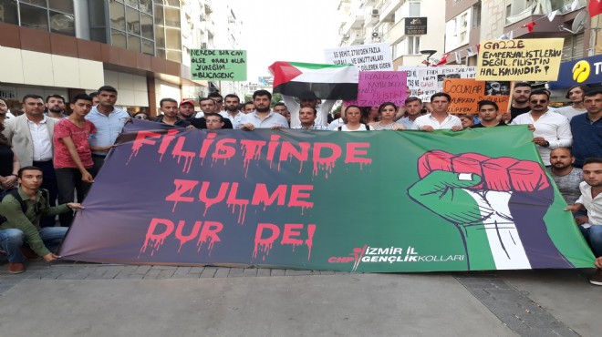 ?'Katil İsrail, Filistin'den Defol', 'Emperyalizm kaybedecek Filistin kazanacak' yazılı dövizler taşıyan grup, 'Filistin'de düşene, dövüşene bin selam', 'Kahrolsun ABD Emperyalizmi' sloganları attı. Basın açıklamasını okuyan CHP İzmir Gençlik Kolları Başkanı Ozan Uyan, Filistin davasına gönül vermiş gençler olarak böyle bir olay vesilesiyle bir araya gelmenin üzüntüsünü yaşadıklarını belirterek, "ABD'nin İsrail Başkonsolosluğu binasını Kudüs'e taşıması kararı, Ortadoğu'da yapılmış bir provakasyondur. Buna tepki gösteren insanlara saldıran İsrail hükümetini bütün insani duygularımızla kınıyoruz. Tepkimiz asla İsrail halkına değildir, bizim tepkimiz 2008 yılında İsrail'in hava saldırısında iki bacağını kaybetmesine rağmen Kudüs'ü savunmak için çıktığı meydanda yine İsrail'in saldırısında hayatını kaybeden bir insana terörist diyen İsrail hükümetinedir" dedi. (DHA)