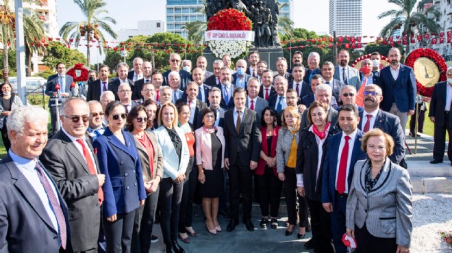 İzmir Büyükşehir Belediye Başkanvekili Mustafa Özuslu da törende yaptığı konuşmada, "Cumhuriyetimizin 100’üncü yılına büyük bir özgüven ve kararlılıkla ilerliyoruz. İkinci yüzyılda sultanlık hayalleri kuranlara karşı yeniden demokratik parlamenter sistemi biz inşa edeceğiz. Türkiye’nin toplumsal barışını ve huzurunu biz sağlayacağız. CHP’liler olarak 10’uncu yıl da oradaydık, 100’üncü yılda da buradayız diyeceğiz. İkinci yüzyıla yaptığımız çağrıyı gür bir sesle haykıracağız. Buradan cumhuriyeti kuran o kutlu iradeye sözümüz olsun, ant olsun” diye konuştu.