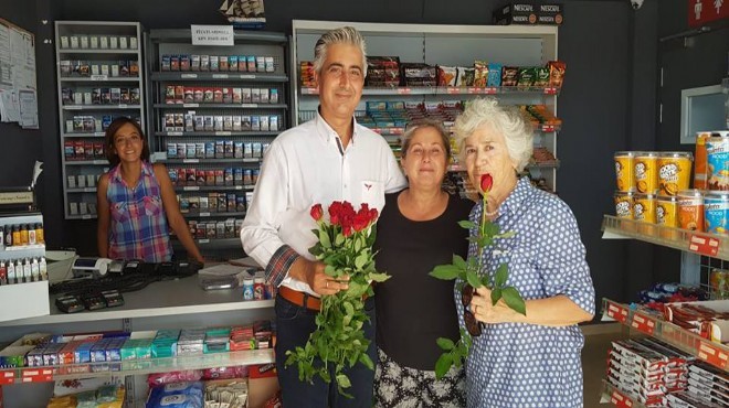 Karaburun ve Mordoğan’da işletmesi olan esnaf kırmızı güllerle bayramı karşıladı. CHP Karaburun İlçe Başkanı Bülent Çumçum’un önderliğinde ellerine çiçek demetlerini alan ilçe örgütü tüm esnafı dolaştı ve bayram kutlaması gerçekleştirdi. Esnafın dert ve sorunlarının dinlendiği bayram ziyaretinde esnafa daha güzel bir Karaburun için neler istediği soruldu. Güzel fikirlerin ortaya çıktığı sohbetlerde dilek ve istekler tek tek not edildi.