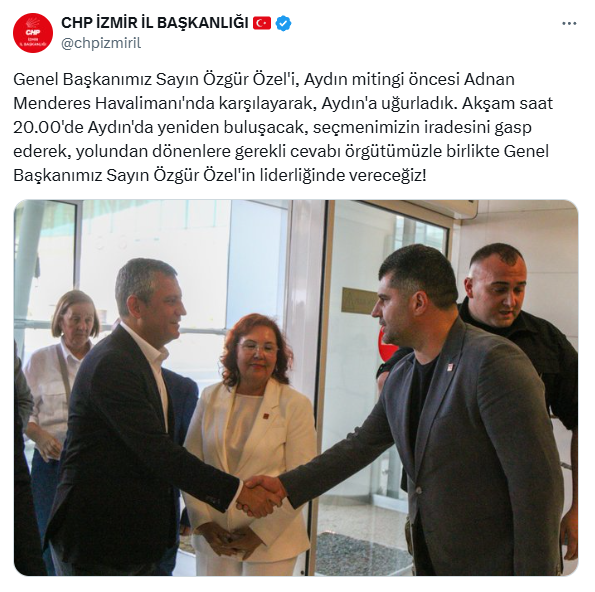 CHP İzmir İl Başkanlığı da sosyal medya hesabından yaptığı açıklamada, “Genel Başkanımız Sayın Özgür Özel'i, Aydın mitingi öncesi Adnan Menderes Havalimanı'nda karşılayarak, Aydın'a uğurladık. Akşam saat 20.00'de Aydın'da yeniden buluşacak, seçmenimizin iradesini gasp ederek, yolundan dönenlere gerekli cevabı örgütümüzle birlikte Genel Başkanımız Sayın Özgür Özel'in liderliğinde vereceğiz!” ifadelerine yer verdi.