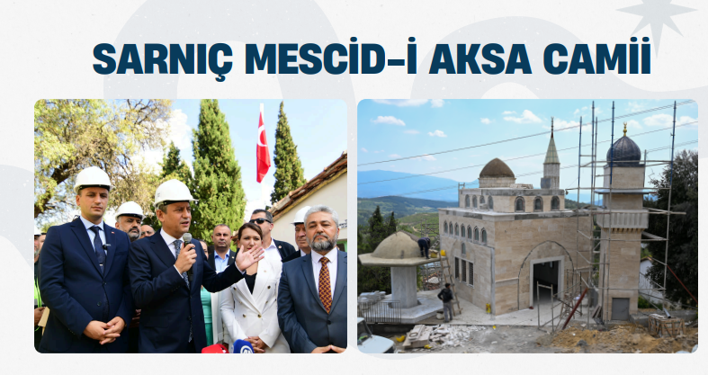 Bornova Belediye Başkanı Ömer Eşki temeli 2024 yılının sonunda atılan Sarnıç Mescid-i Aksa camiinin yapımının tamamlandığı ve açılışının önümüzdeki mayıs ayında yine CHP Genel Başkanı Özgür’in katılımı ile yapılacağını açıkladı.