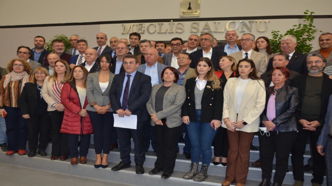 GERÇEKİZMİR - İzmir’de 9 Eylül 2022’de yapılan 100’üncü yıl kutlamalarında Nutuk’tan alıntıladığı sözler nedeniyle İçişleri Bakanlığı tarafından hakkında soruşturma açılan İzmir Büyükşehir Belediye Başkanı Tunç Soyer’e bir destek de İzmir Büyükşehir Belediyesi (İzBB)CHP Meclis Grubu’ndan geldi. İzmir Büyükşehir Belediyesi’nin kasım ayı beşinci meclis oturumu öncesinde CHP Meclis Grubu, basın açıklaması yaptı. Başkan Soyer’e tam destek verilen açıklamayı CHP Grup Başkanvekili Murat Aydın okudu.