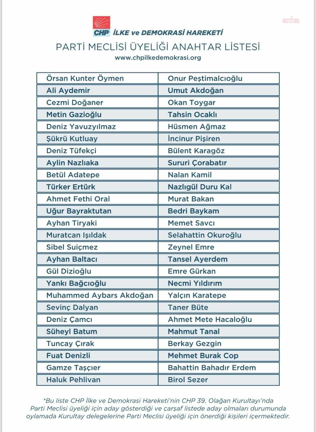 Öte yandan CHP İlke ve Demokrasi Hareketi Sözcüsü Örsan Kunter Öymen; Umut Akdoğan, Murat Bakan, Yankı Bağcıoğlu, Berkay Gezgin, Aylin Nazlıaka, Gamze Taşcıer ve Deniz Yavuzyılmaz’ın da aralarında olduğu 52 kişilik bir anahtar liste hazırladı.