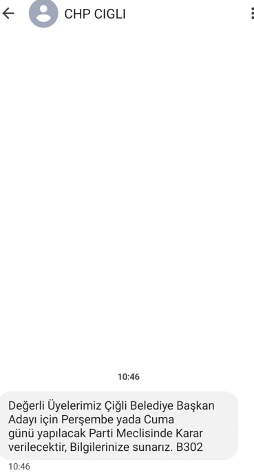 CHP Çiğli İlçe Başkanlığı'ndan atılan SMS'te, "Değerli Üyelerimiz Çiğli Belediye Başkan Adayı için Perşembe yada Cuma günü yapılacak Parti Meclisinde Karar verilecektir, Bilgilerinize sunarız" ifadelerine yer verildi.