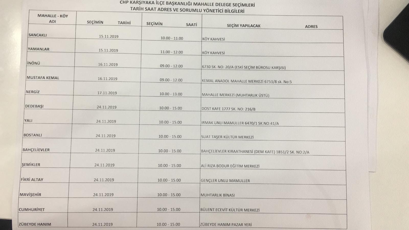 İlçe Başkanı Uğur Yıldırım ve İl Başkan Yardımcısı Adnan Alabay’ın desteklediği beyaz listelerle Karşıyaka Belediye Başkanı Cemil Tugay ve muhaliflerin desteklediği mavi listeler arasındaki rekabette bazı mahallelerde arbede çıkarken Bahariye ve Latife Hanım Mahallesi’nde seçim iptal edildi. Yamanlar ve Sancaklı'daki seçimler de ileri bir tarihe ertelenmişti.