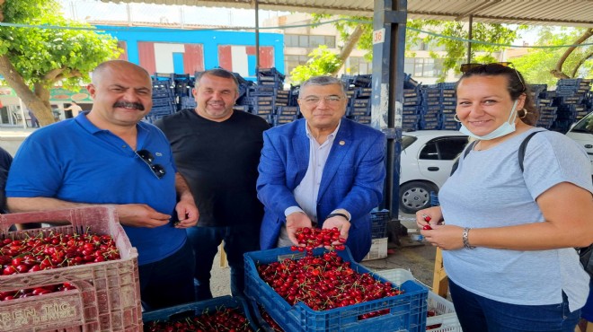 CHP İzmir Milletvekili Kamil Okyay Sındır, Kemalpaşa’da Bağyurdu, Yiğitler ve Ören kiraz alım noktalarında üreticilerle buluştu, çiftçinin düşük alım fiyatları nedeniyle ürününü masrafın yarı fiyatına dahi satamadığını söyledi.