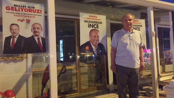 Baratalı, evinin dört bir yanındaki pencereleri İnce ve CHP Lideri Kemal Kılıçdaroğlu ile vekil adaylarının afişleriyle donattı.