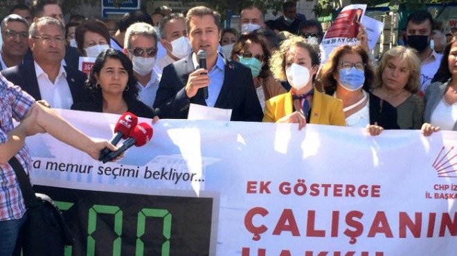 İZMİR - Cumhuriyet Halk Partisi (CHP) İzmir İl Başkanlığı, AK Parti iktidarı ve Cumhurbaşkanı Recep Tayyip Erdoğan tarafından, 39 ay önce söz verilmesine rağmen, memurlara verilmeyen 3600 ek gösterge hakkı için, İzmir Konak Meydanı'nda Basın açıklaması düzenledi.