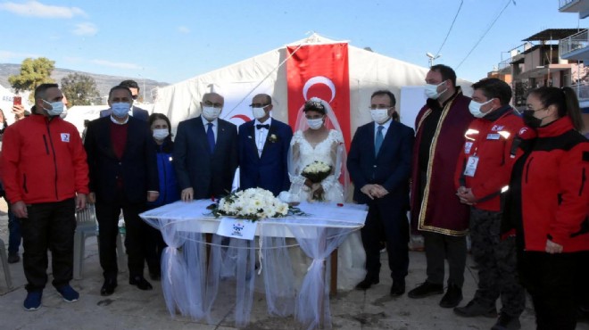 Çadır kentte gerçekleşen nikahı, Çiğli Belediye Başkanı Utku Gümrükçü kıydı. İzmir Valisi Yavuz Selim Köşger, İçişleri Bakan Yardımcısı İsmail Çataklı, Balçova Kaymakamı Ahmet Hamdi Usta, Kızılay Genel Müdür Yardımcısı İbrahim Özer ve Kızılay Karşıyaka Şube Başkanı Kamil Karadeniz ise çiftin nikah şahidi oldu.