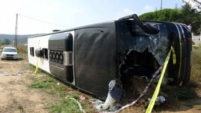 İzmit'ten 3 personel ve 52 yolcu ile hareket eden Özgür Ercan'ın kullandığı 34 KLC 80 plakalı otobüs, Çanakkale-Ezine kara yolunda kontrolden çıkarak yol kenarındaki su kanalına devrildi.