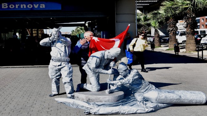 Bornova Metro İstasyonu çıkışında sahnelenen canlı heykel performansı, vatandaşlardan büyük ilgi gördü. Vatandaşlar Çanakkale Savaşı’ndan sahneleri canlandıran heykellerle hatıra fotoğrafları çektirdi.