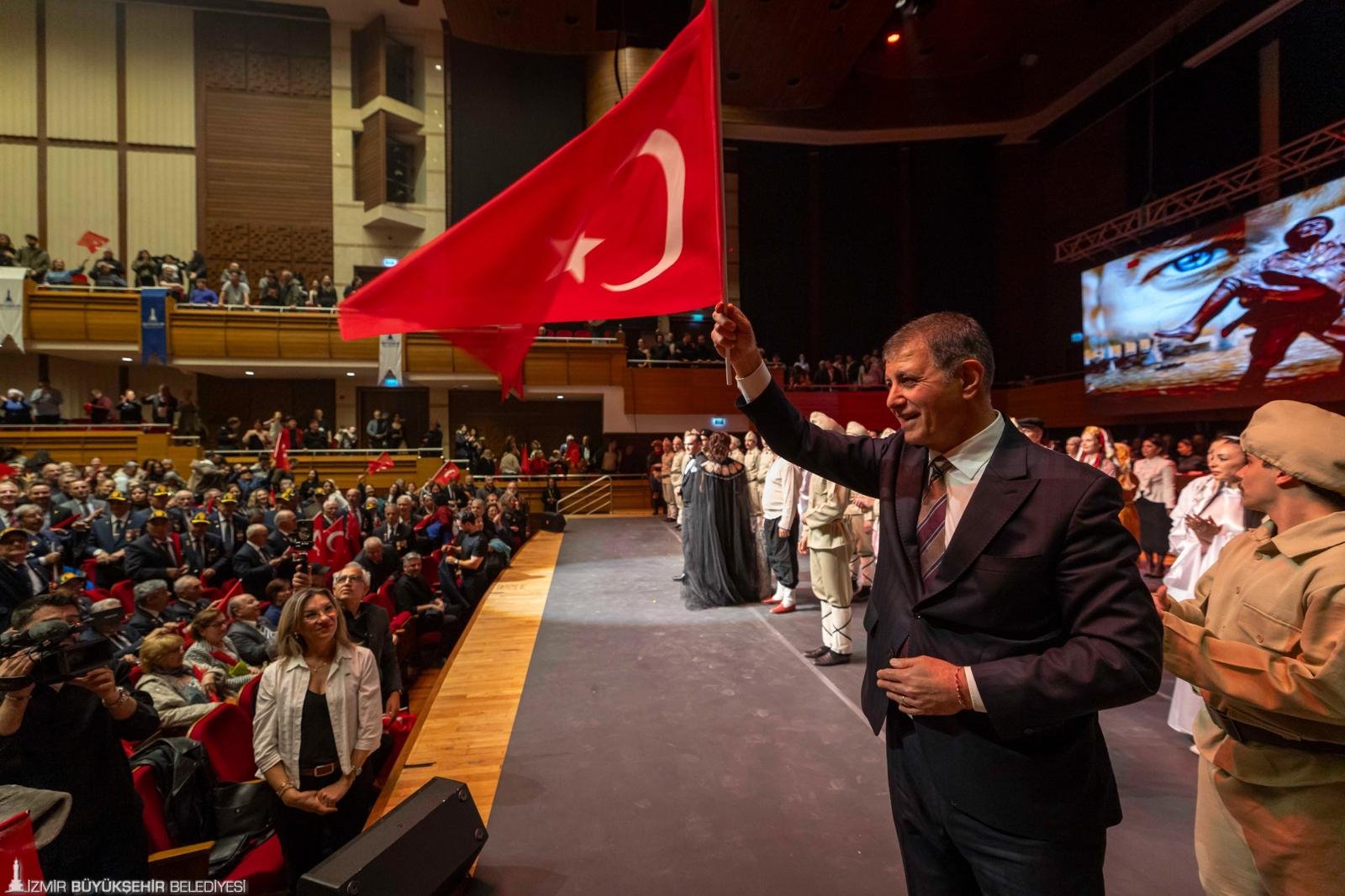 Gecede konuşan İzmir Büyükşehir Belediye Başkanı Dr. Cemil Tugay, gösterinin kendisini çok etkilediğini belirterek emeği geçenlere teşekkür etti. Çanakkale Savaşı’nın hem Türkiye hem de dünya tarihi açısından en önemli savaşlardan biri olduğunu vurgulayan Tugay, “Bu savaşta 253 bin insanımızı kaybettik. Bir yönüyle kirli bir savaştı” dedi. Gazi Mustafa Kemal Atatürk’ün liderliğine dikkat çeken Tugay, “Atamız büyük bir insan, çok güzel yürekli bir liderdir. Vatanı için her zaman canını vermeye hazırdı. O savaşta bir şarapnel parçasıyla göğsünden yaralanmıştı. Ben bu olayı tarihimiz açısından bir dönüm noktası olarak görüyorum. Allah o büyük insanı Türk milletine bağışladı” diye konuştu.