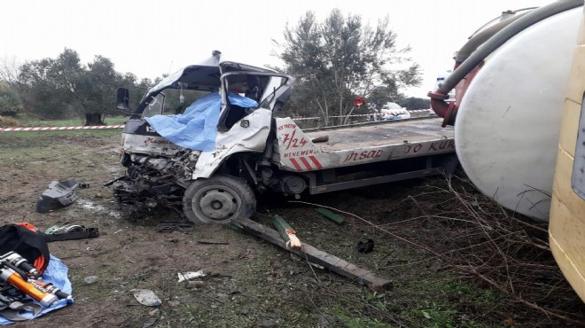Kaza, saat 13.00 sıralarında Foça'yı İzmir -Çanakkale karayoluna bağlayan yolun Bahadır Boğazı mevkisinde meydana geldi. Foça'ya bağlı Bağarası Mahallesi'nde meydana gelen başka bir kazadaki araçları çekmek için Menemen ilçesinden yola çıktığı öğrenilen Mustafa Akcan'ın kullandığı 45 DJ 171 plakalı oto çekicisi, karşıdan gelen S.Ç. yönetimindeki 35 ENP 51 plakalı vidanjör ile çarpıştı. Çekici şoförü Akcan, olay yerinde yaşamını yitirirken, çarpışmanın şiddetiyle kontrol çıkıp devrilen vidanjörün şoförü S.Ç. ise ağır yaralandı. Yoldan geçen diğer araç sürücülerin ihbarı üzerine kaza yerine jandarma ve sağlık ekipleri sevk edildi. Sağlık ekiplerinin olay yerindeki ilk müdahalesinin ardından S.Ç., Menemen Devlet Hastanesi'ne kaldırıldı. Burada tedaviye alınan S.Ç.'nin hayati tehlikesinin bulunduğu öğrenildi. Çekici şoförü Akcan'ın cesedi ise jandarma ve savcının olay yerindeki incelemelerinin ardından Aliağa Devlet Hastanesi morguna kaldırıldı. Kazayla ilgili soruşturma başlatıldı. (DHA)