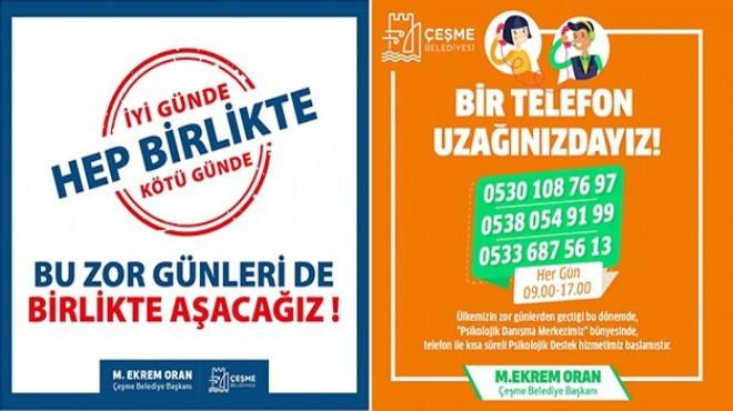 Çeşme Belediye Başkanı M. Ekrem Oran, “Ülkemizin zor günlerden geçtiği bu dönemde, “Psikolojik Danışma Merkezimiz” bünyesinde, telefon ile kısa süreli “Psikolojik Destek Hizmetimiz” başladı. Kendisini kötü hisseden vatandaşlarımızın bir telefon uzağındayız. Vatandaşlarımızdan bağışıklıkları kadar psikolojilerini de iyi tutmalarını istiyoruz. Bu zor günleri birlikte atlatacağız” dedi.