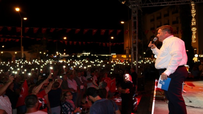 Her şey çok güzel oldu. Biz bu seneki Fener Alayı’nda meşale yerine cep telefonu kullandık, meşale bütçelerini yanan ormanlık alanlarımıza fidan dikerek kullanacağız. Biz Cumhuriyet’in aydınlığını bu sene telefonlarımızın ışıkları ile vereceğiz. Cumhuriyet’in aydınlık yüzü, kalesi Çeşme ailem, iyi ki varsınız” dedi.